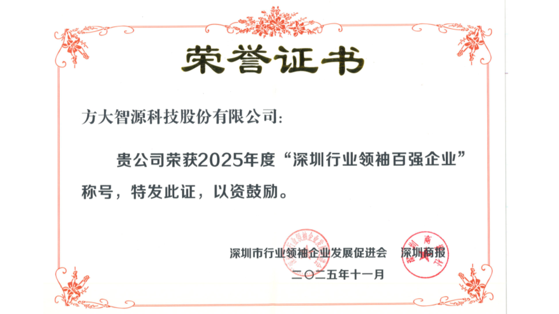 2025年,方大智源連續第七年榮登“2025深圳行業(yè)領(lǐng)袖企業(yè)100強”榜單,近期受邀參加第七屆“書(shū)香圳好”深圳行業(yè)領(lǐng)袖科技創(chuàng )新生態(tài)大會(huì )。該榜單評選歷時(shí)6個(gè)月,經(jīng)深圳市工商業(yè)聯(lián)合會(huì )(總商會(huì ))、深圳報業(yè)集團指導,由深圳市行業(yè)領(lǐng)袖企業(yè)發(fā)展促進(jìn)會(huì )與深圳商報/讀創(chuàng )客戶(hù)端共同發(fā)布。入選企業(yè)具備精準市場(chǎng)定位、領(lǐng)先市場(chǎng)份額,構建了技術(shù)、性能、成本及品牌壁壘,憑借深厚的行業(yè)護城河成為標桿典范,對深圳培育優(yōu)質(zhì)創(chuàng )新生態(tài)和推動(dòng)行業(yè)突破有關(guān)鍵作用。